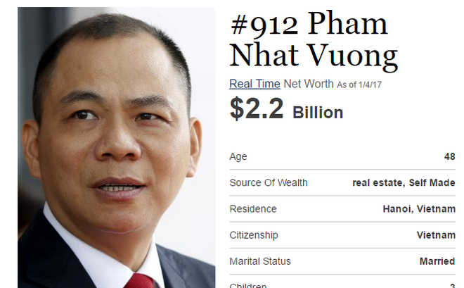 Không còn ở ngôi vương tại Việt Nam nhưng ông Vượng vẫn là người Việt duy nhất được xướng tên trên danh sách tỷ phú thế giới do tạp chí Forbes bầu chọn. Thậm chí, so với thời điểm chốt danh sách hàng năm vào đầu tháng 3 của Forbes, thứ hạng của ông Vượng đã tăng hơn 100 bậc, tổng tài sản đạt hơn 2,2 tỷ USD.